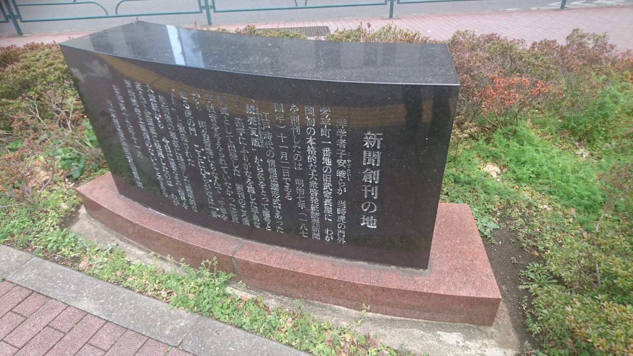 銀座線虎ノ門駅3番出口を出て、虎ノ門交差点を外堀通り沿いに西に進んだところにある緑地帯に、黒い石碑が建てられていました。これは読売新聞の発祥の地で、読売新聞は1874年に「日就社」によって創刊されたそうです。坪内逍遙が文学主筆になったり、尾崎紅葉や幸田露伴が入社するなど、多くの偉人が関わっていたのには驚きました。