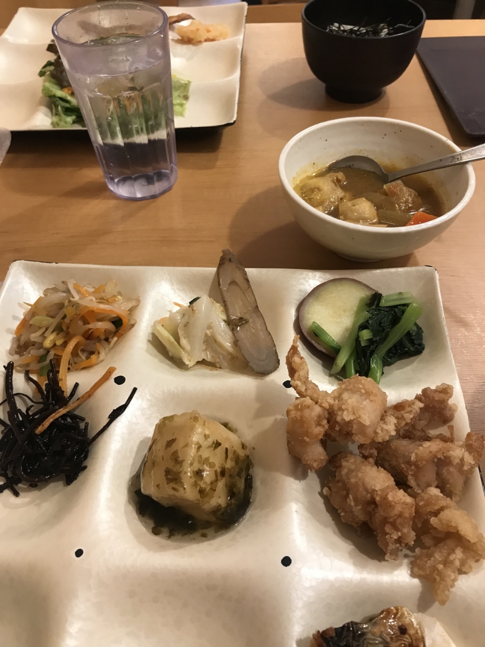 自然食はーべすとさんです。ランチビュッフェが1580円からです。ドリンクバーは別料金になります。こちらのサラダはパワーサラダがおススメです。トッピングにクルミやクルトンもあり、ドレッシングは4種類あります。