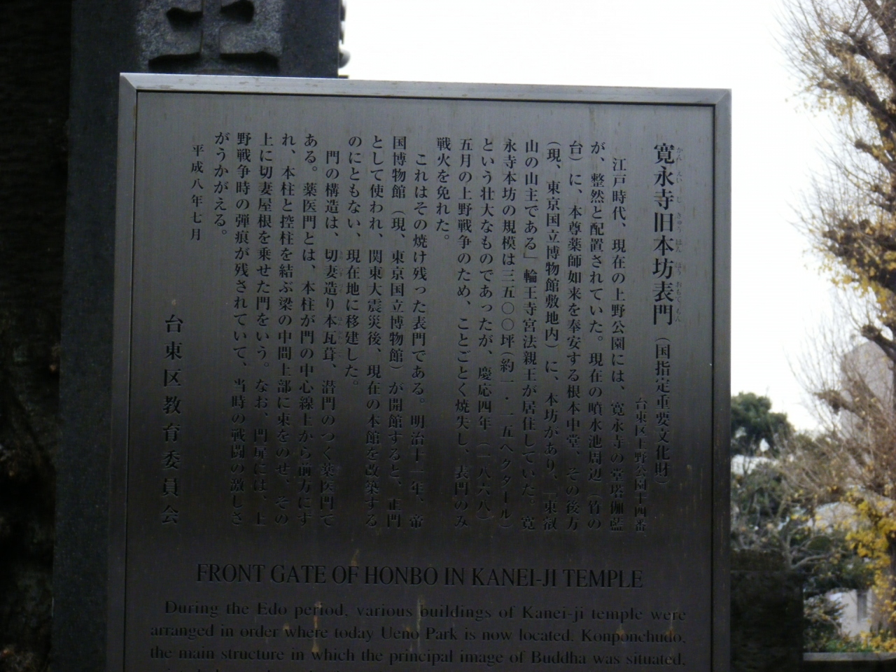 2019年12月に上野を散策した際に立ち寄りました。上野恩賜公園の北東に位置し、都道452号線沿いの寛永寺輪王殿にある門になります。何故か正面である都道452号線からは入口が閉ざされており間近で門を見学する事が出来ないのですが、寛永寺輪王殿側からなら門のすぐ近くまでいけるので間近で見学する事ができます。1868年の上野戦争において、この辺り一帯焼け野原となってしまいましたが、奇跡的に寛永寺旧本坊表門 だけは無事に残っていたそうで、大変貴重な建築物なので是非ともじっくりと見学される事をお勧めいたします。黒色の門は綺麗で迫力があって良かったです。