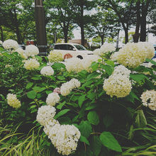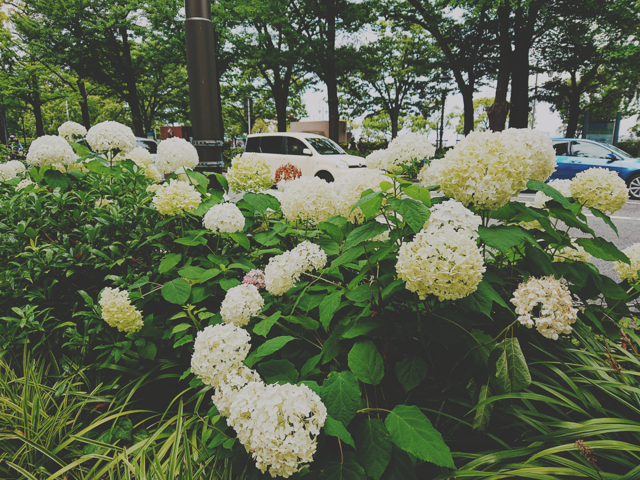 銀杏並木道が素敵な通りですが、6月中旬の山下公園通りは植え込みのアナベルが咲き乱れます。