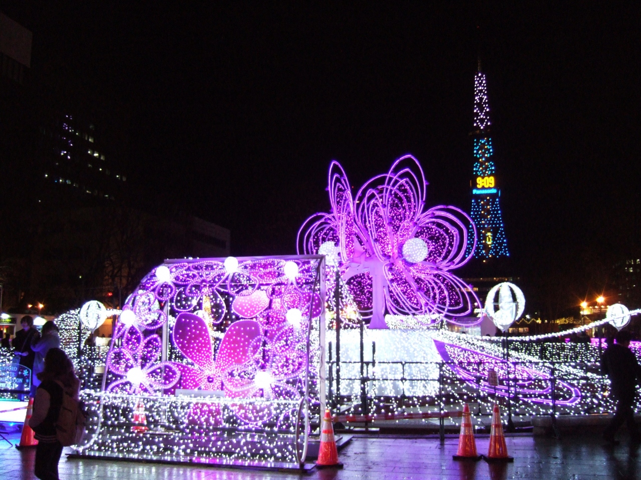 札幌大通公園の東端に立つテレビ塔。数年前に塗り替えられ、昼間はちょっと目立つ色になってしまいました。夜は夜空に溶け込みますが、イルミネーションがきれいに輝いています。展望台からはホワイトイルミネーションを一望できますが、混雑覚悟です。