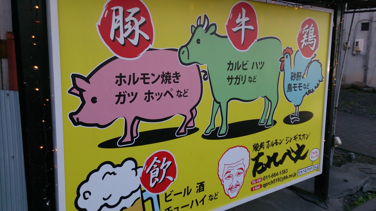札幌の地下鉄南北線の発寒南駅から歩いて5分ほどのところにある焼き肉屋さんです。店構えは、古いです。しかし、焼肉屋さんは、こうでないといけません。中に入ると期待通り。炭が入った七輪が運ばれてきて、これで肉を焼くのです。肝心の肉を注文しようとメニューを見ると、ビックリ。豚の絵が描かれて、ここの部分ですという図があるのですが、肉の方はというと皿に盛られた写真でなく、内臓そのものの写真が載っていました。ほとんど理科の解剖のような写真でした。肉は、最高においしく写真を見ながら盛り上がりました。