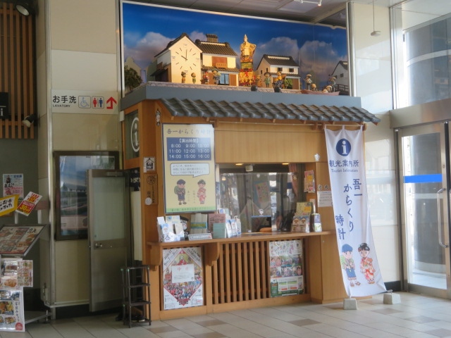 観光案内所の上部に吾一からくり時計があります、栃木出身の文豪山本有三の小説・路傍の石の吾一にちなんで名前が付けられています、イメージは蔵の街です、毎時00分に作動します。