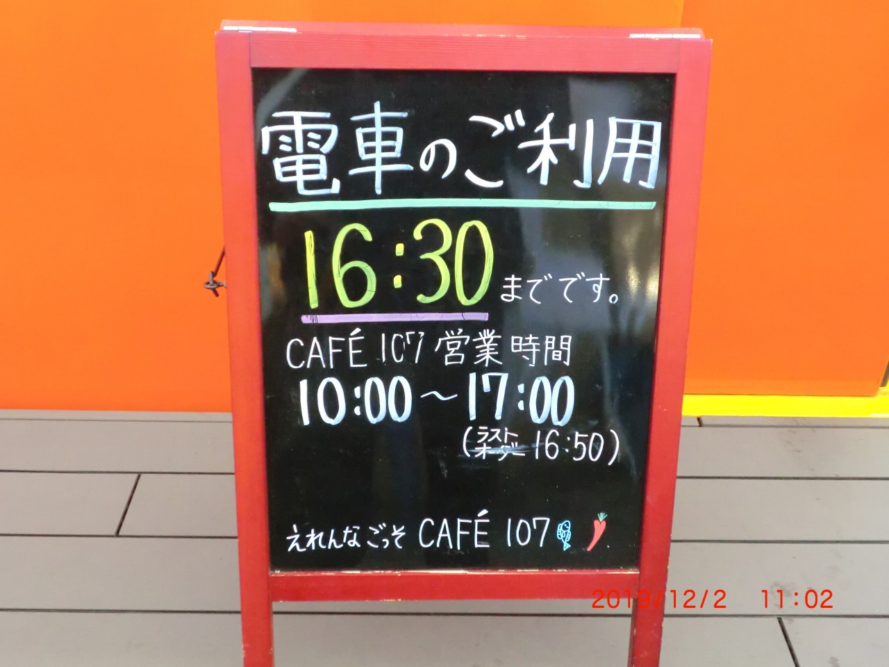 ここはカフェでオレンジ色の電車がありすぐに分かります。時間的には蒲鉾の博物館や売店のある道路を挟んで反対側にあります。蒲鉾の売店専用の駐車場が満杯の場合はここの駐車場に入れると空いてます。お茶するわけでもなく見学だけにしました。電車の中でお茶できます。