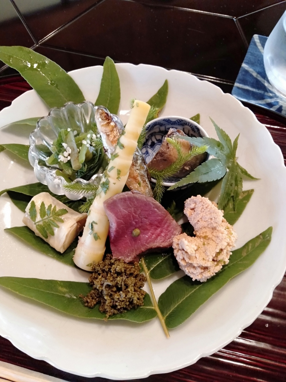 京都駅から車で1時間と少し。山奥なので市街地に比べるとひんやりしていました。半個室の様になっていて座敷にテーブル席です。部屋から立派なお庭を眺められます。6月の初旬だと、若鮎、熊鍋、山椒もまだギリギリ頂けました。素材の味がしっかりして美味しかったです。