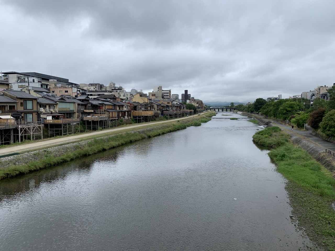いつも京都の四条大橋より鴨川のゆっくりした流れと河原カップルをボ~ッと眺めている私ですが、今回はそのような光景はなく河床にも人はほとんどいない状態でした。