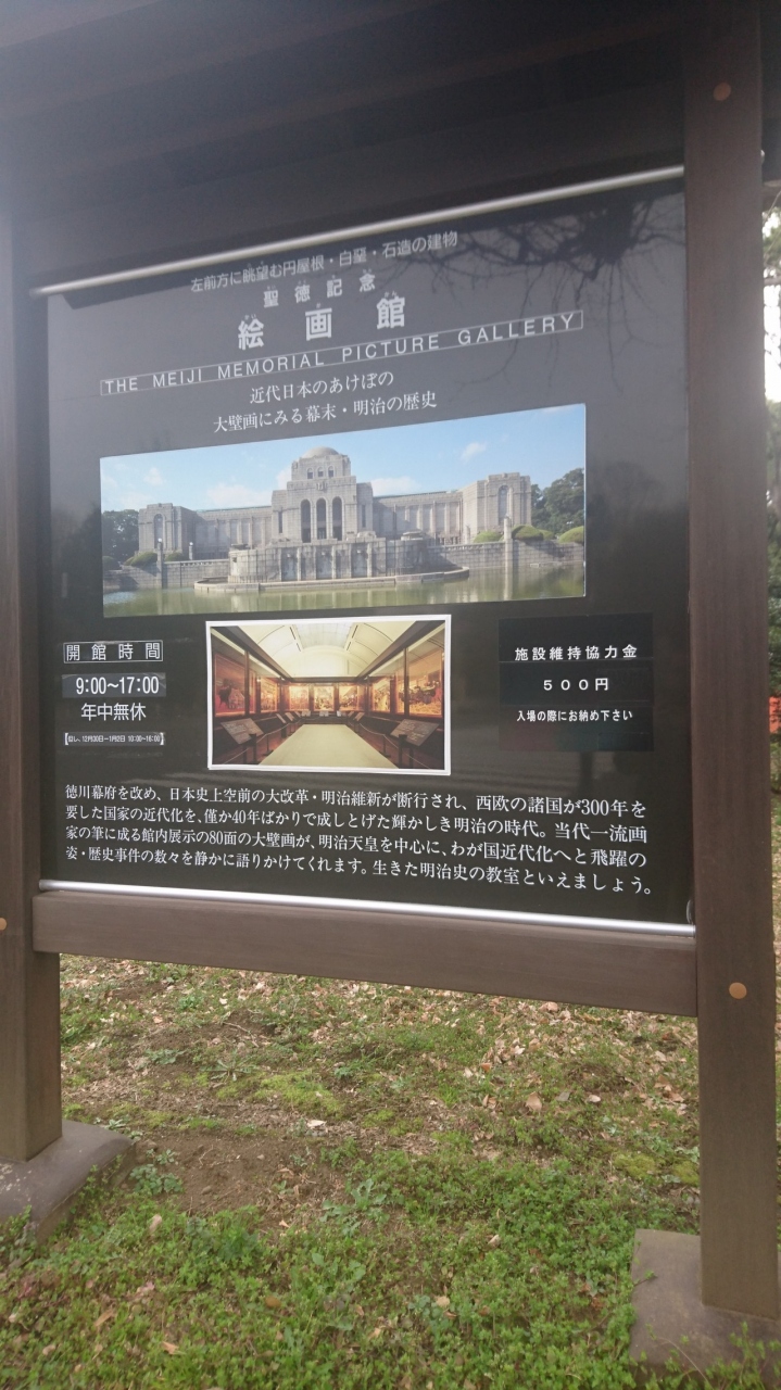 明治神宮外苑と言えば野球場しか知らず、その中心の楕円形部分に絵画館があるということも近くに行って初めて知りました。時間が早くて中に入ることはできませんでしたが、外苑入口から銀杏並木越しに見る建物は荘厳な雰囲気でした。中には明治天皇が成し遂げた偉業を描いた名画が飾られているそうです。