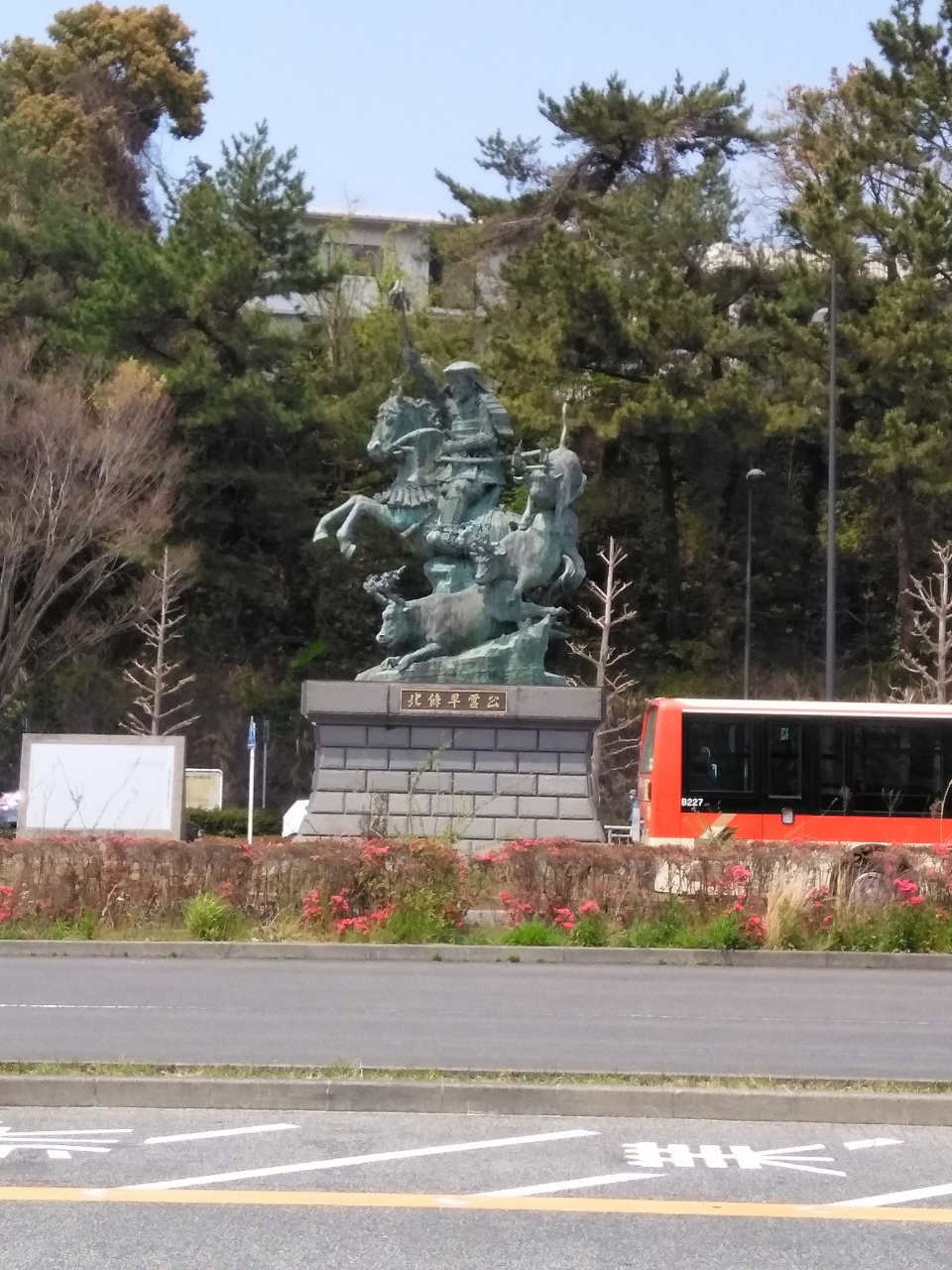 私の地元=小田原の名将となってますが戦国時代の1932年~15919年の生涯で下級武士から大名になった「早雲公」ですが小田原駅の西口=裏駅に有ります。高さは6~7mですが今は青錆で少し見栄えは悪いです。私的には地元の名将なので表駅=東口に置いてほしいです。
