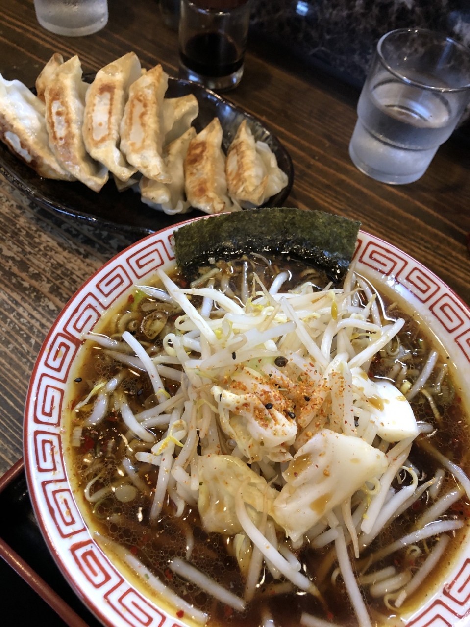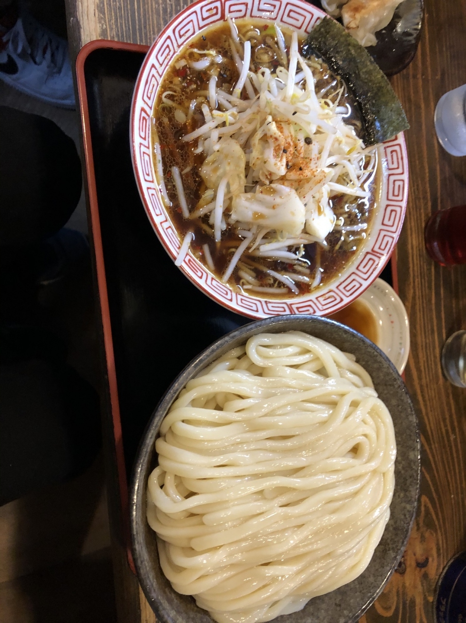 福島駅西口から徒歩数分で見つかる麺屋有名店。餃子とつけ麺中盛を注文した。800gの麺と、中盛でも超ど級サイズでコスパ最高の店。昼訪れたが客が外にまで並ぶ大繁盛店。店員さん二人のみで回していて、オーダーから食事が提供されるまでは回していまぁまぁ時間がかかり相当忙しそうだった。餃子も絶品。
