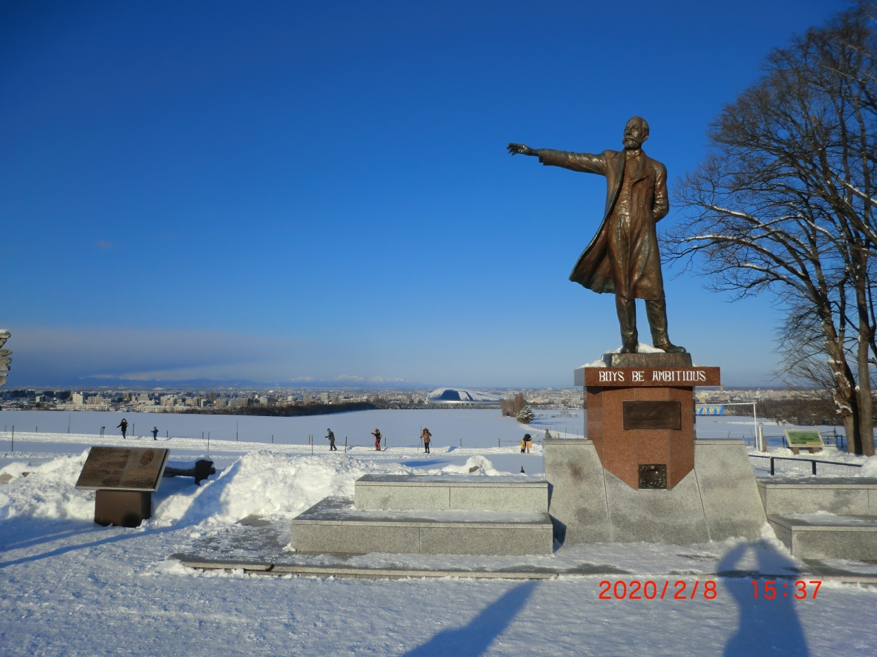 羊ケ丘に行ったらありました。以前は北海道大学の構内に会ったのですが大学が観光地化してここに移動したそうです。胸から上の像は今でも北海道大学にはいくつもあるそうです。博士の偉業や有名な言葉は省略します。この像はどこを指で指しているのでしょうか。