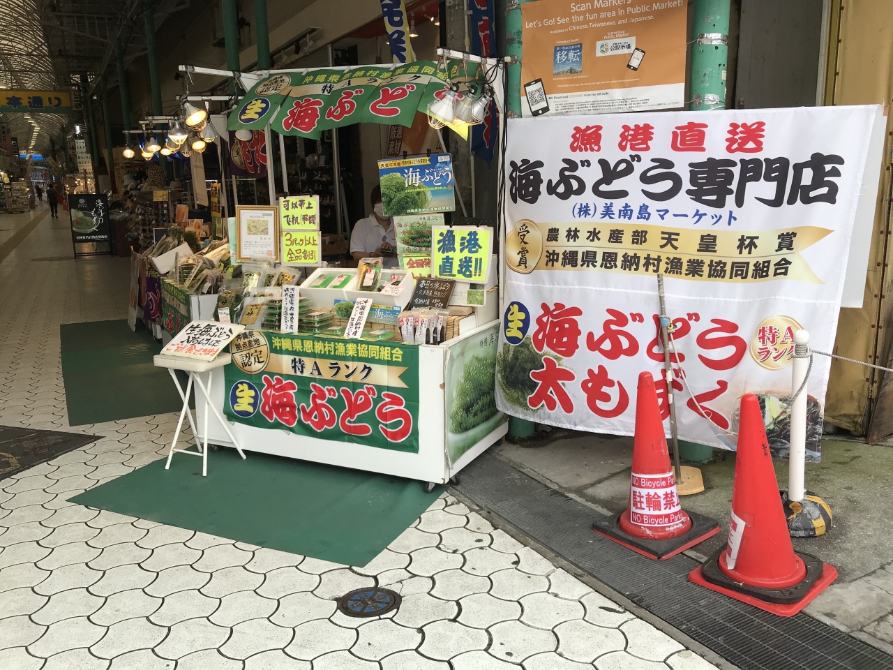 フルーツや野菜、沖縄のお菓子、お土産用の衣料品などを売る店が集まっている通り