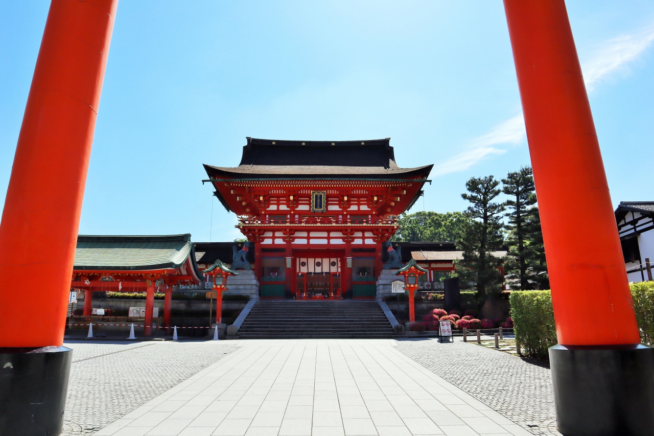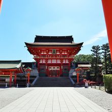 伏見稲荷大社の楼門(国重文)、本殿や稲荷山を守護するように建っています。