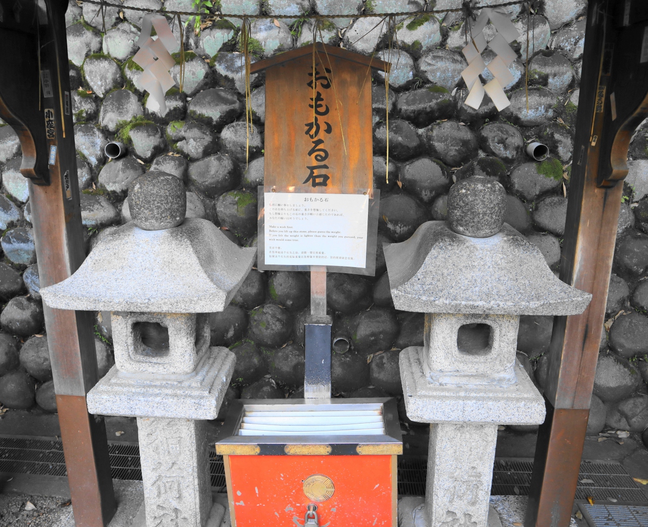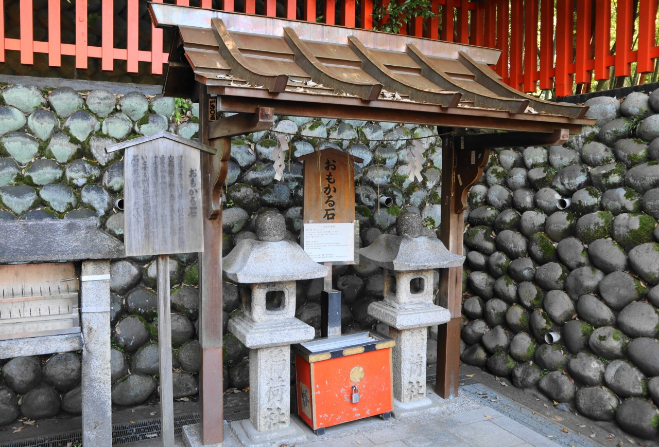 「おもかる石」と書かれた立て札を読むと、石灯篭の空輪(頭)を持ち上げ、そのときに感じる重さが、自分が予想していたよりも軽ければ願い事が叶い、重ければ叶い難いとする試し石、とあります。
