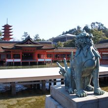 厳島神社の本殿がある前方に広がっているスペースです。こちらからは真正面に海に浮かぶ大鳥居を見ることができる絶好の写真撮影スポットで、記念撮影をしている人が多く見られました。また、結婚式の撮影をしている方もいました。