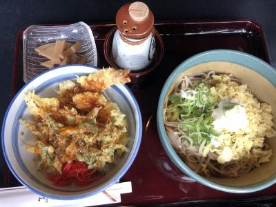 店内はあまり広くないですが庭園を眺めながら食事を。今回はミニ天丼とお蕎麦のセット。冷たい蕎麦は冷やがけか盛りを選ぶことができました。