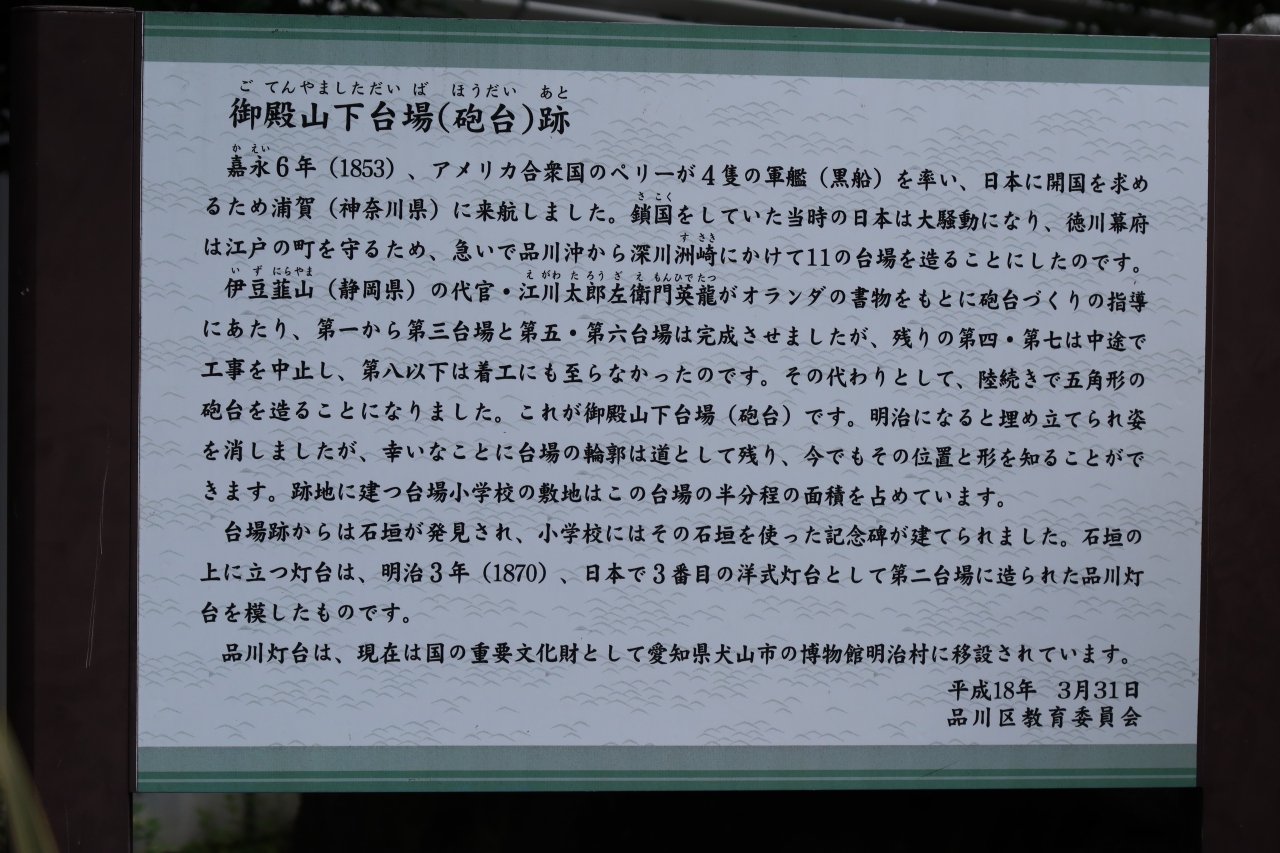 北品川駅から歩いて5分程の所にある台場小学校の校門の右手に品川灯台のレプリカが置かれています。実はこの小学校のある場所自体が江戸末期に江戸湾防衛の為に作った台場の跡です。特段見所はなく、レプリカ灯台の置かれている石垣が台場の石垣であったということ位です。