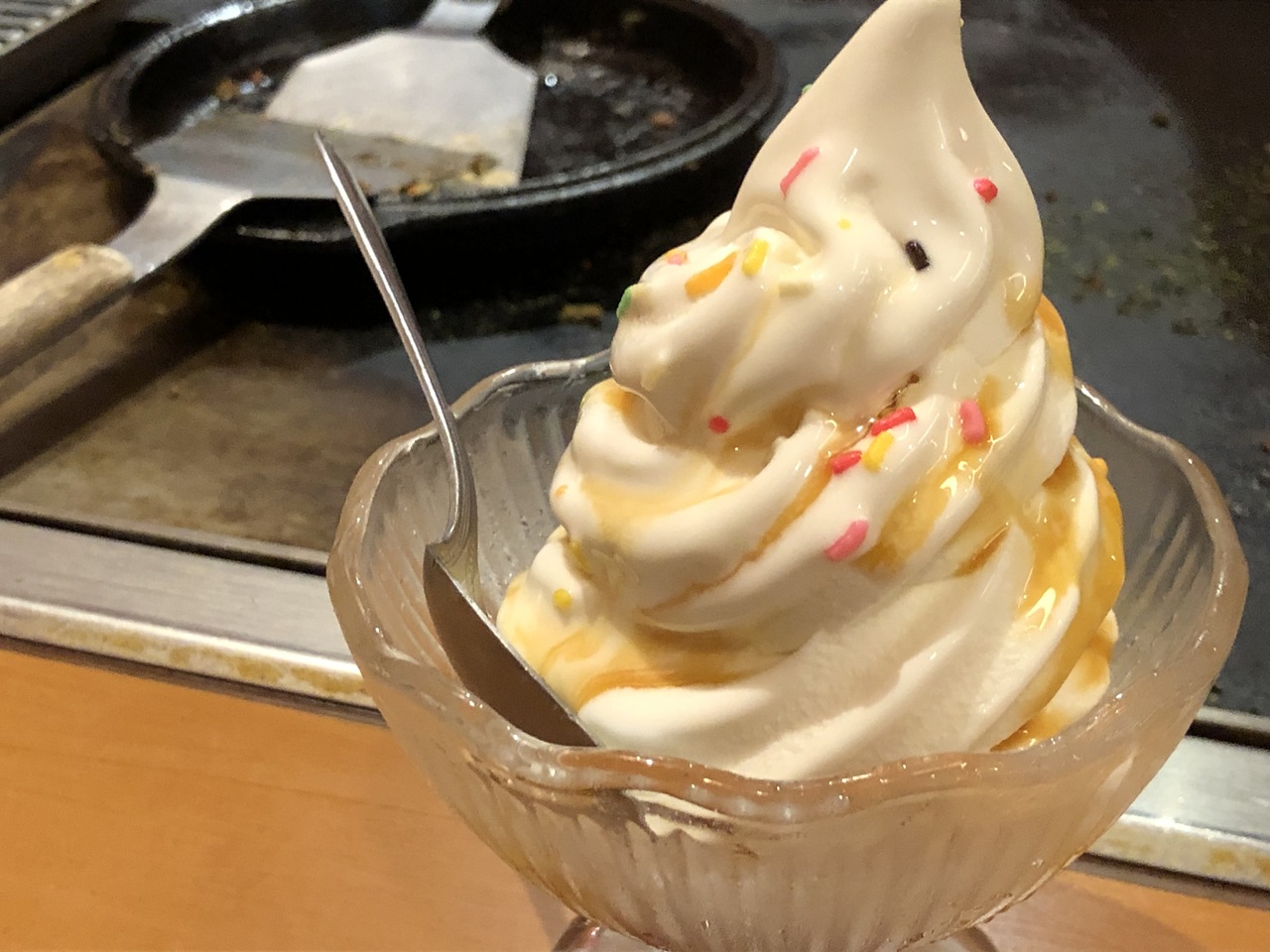 ゲソ焼きはちょうど良い塩加減。ビールどんどんいきます。定番の豚たまに海鮮塩焼きそば。シメはキャラメルソースたっぷりのソフトクリーム!