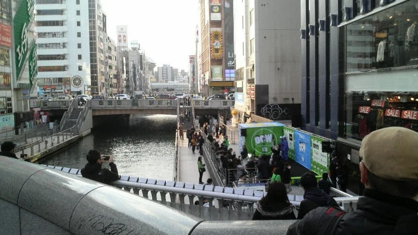 (もちろん昼間でも相変わらずの人気スポットで、記念撮影をする人が絶えませんでした。看板のそばの道頓堀沿いにはイベントスペースもあり、こちらにも人が集まっていました)