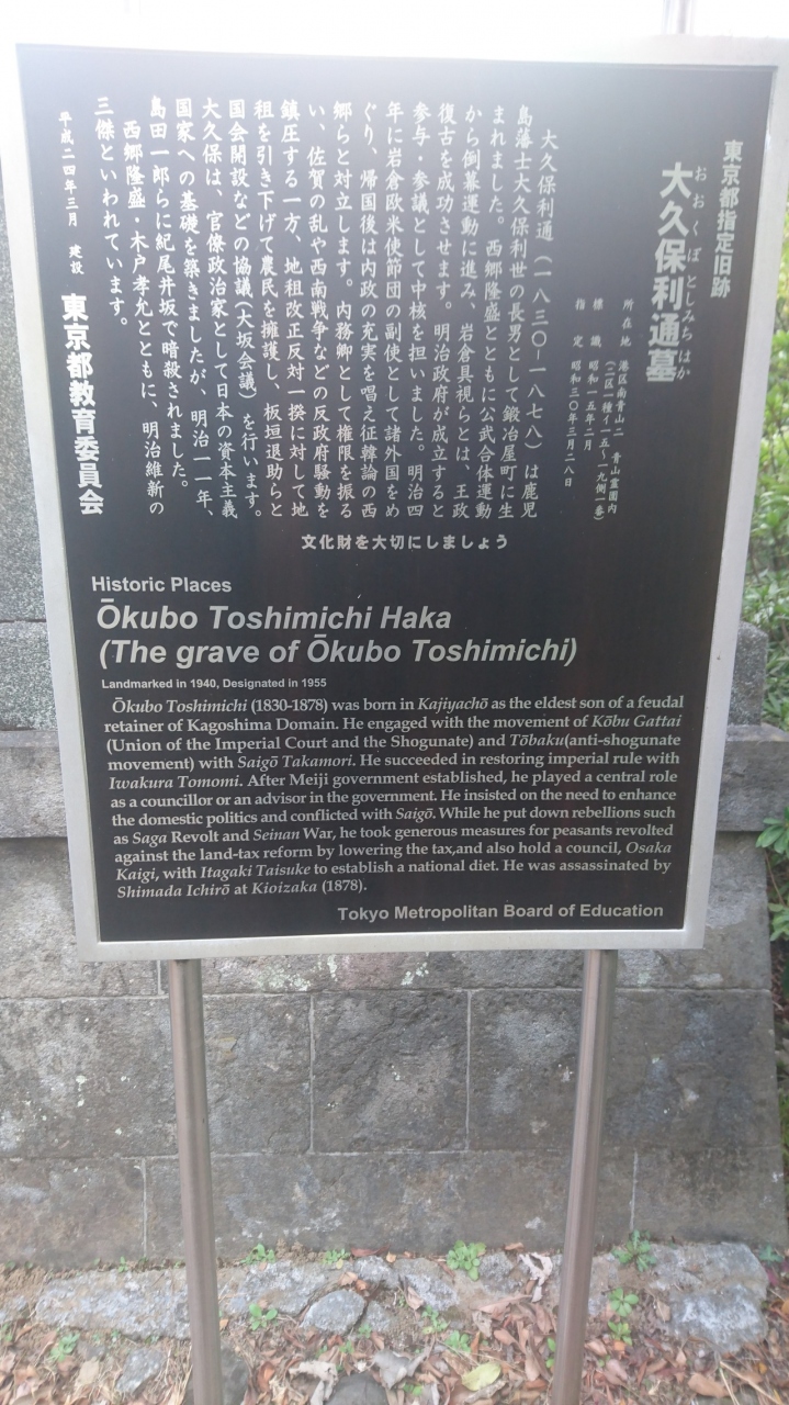 青山霊園の北側にある正面入り口から入ってすぐの場所に大久保利通のお墓がありました。さすがは明治維新の英雄の墓だけあって、とても立派なものでした。敷地には鳥居があり、階段を上がった先には大きな墓石が建立され、改めて偉人であることを感じました。