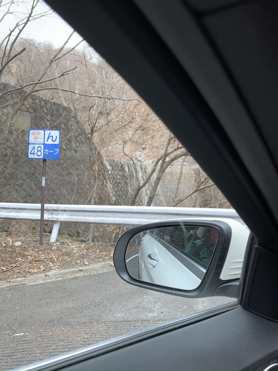 紅葉の時期には、テレビのニュースで大渋滞の様子が流れていますが、今の時期は、そんなこともなく平日でもあったので、すいすいと走ることができました。カーブごとに看板があり、いろはにほへとの文字が書かれていました。本当にくねくねとカーブが続きますので、車酔いをする方は対策が必要です。