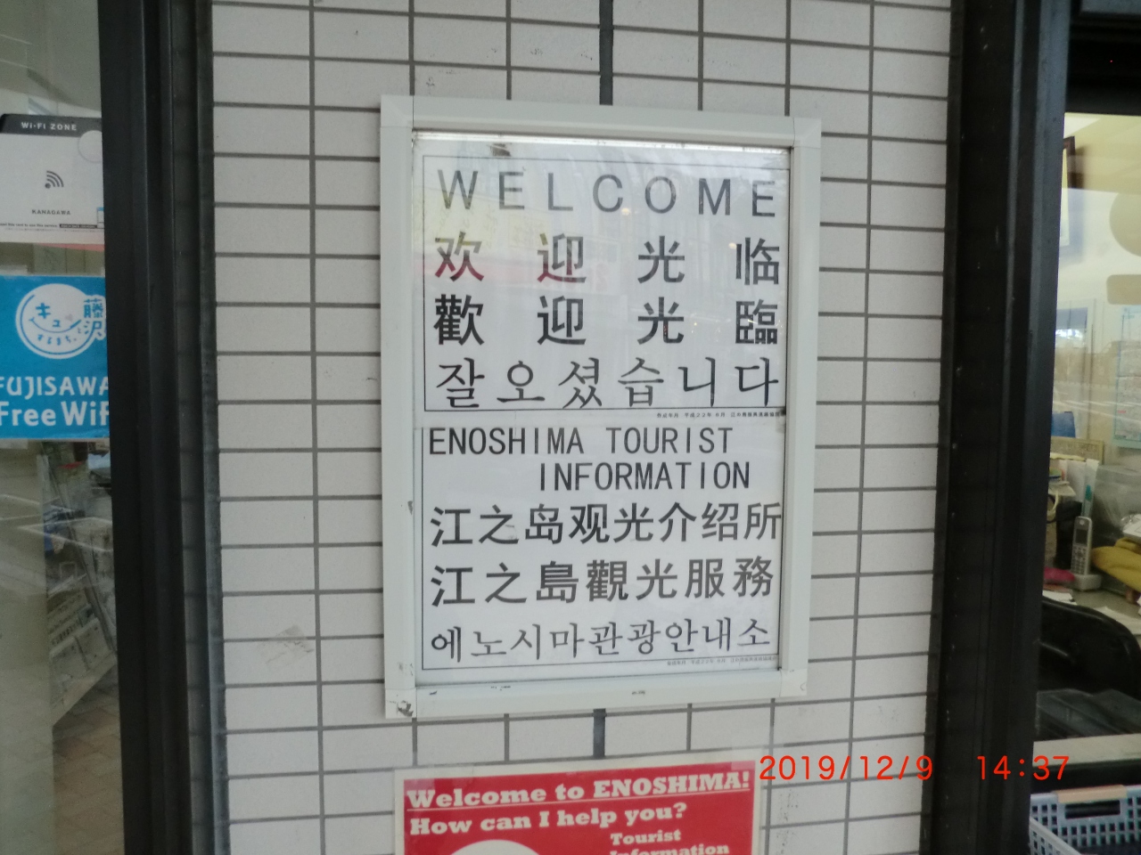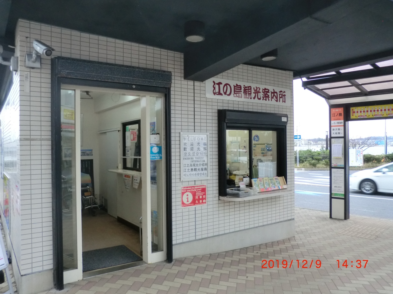 行くときは気が付かず、帰りお土産を探してブラブラしていたら小さな看板に「江の島観光案内所」と書いてありました、屋根の下にあり気づかないでしょう。島の駐車場から歩いてくると分かるかもしれません。一応多国籍語で看板がありました。折角なのでパンフはもらってきました。係の人は居なかった記憶です。