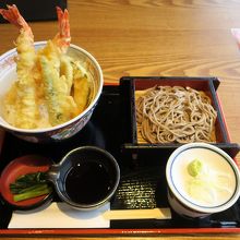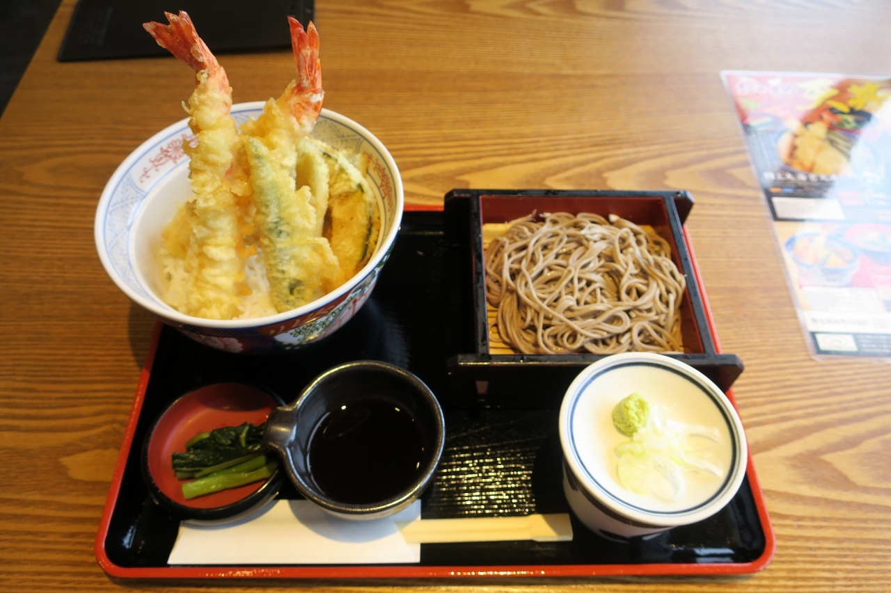コロナの影響でほとんどの店が営業していない中で、数少ない営業店。そばメインのチェーン店だが、天丼のほか天ぷらを中心としたメニューも扱う。ランチ時に「特上大海老天丼」を注文。名前の通り、大きいエビ天が2本のほか、天ぷらが載る。天丼のたれは別添えになっており、サクサクの食感と、たれのしっとりした食感どちらもたのしめる。