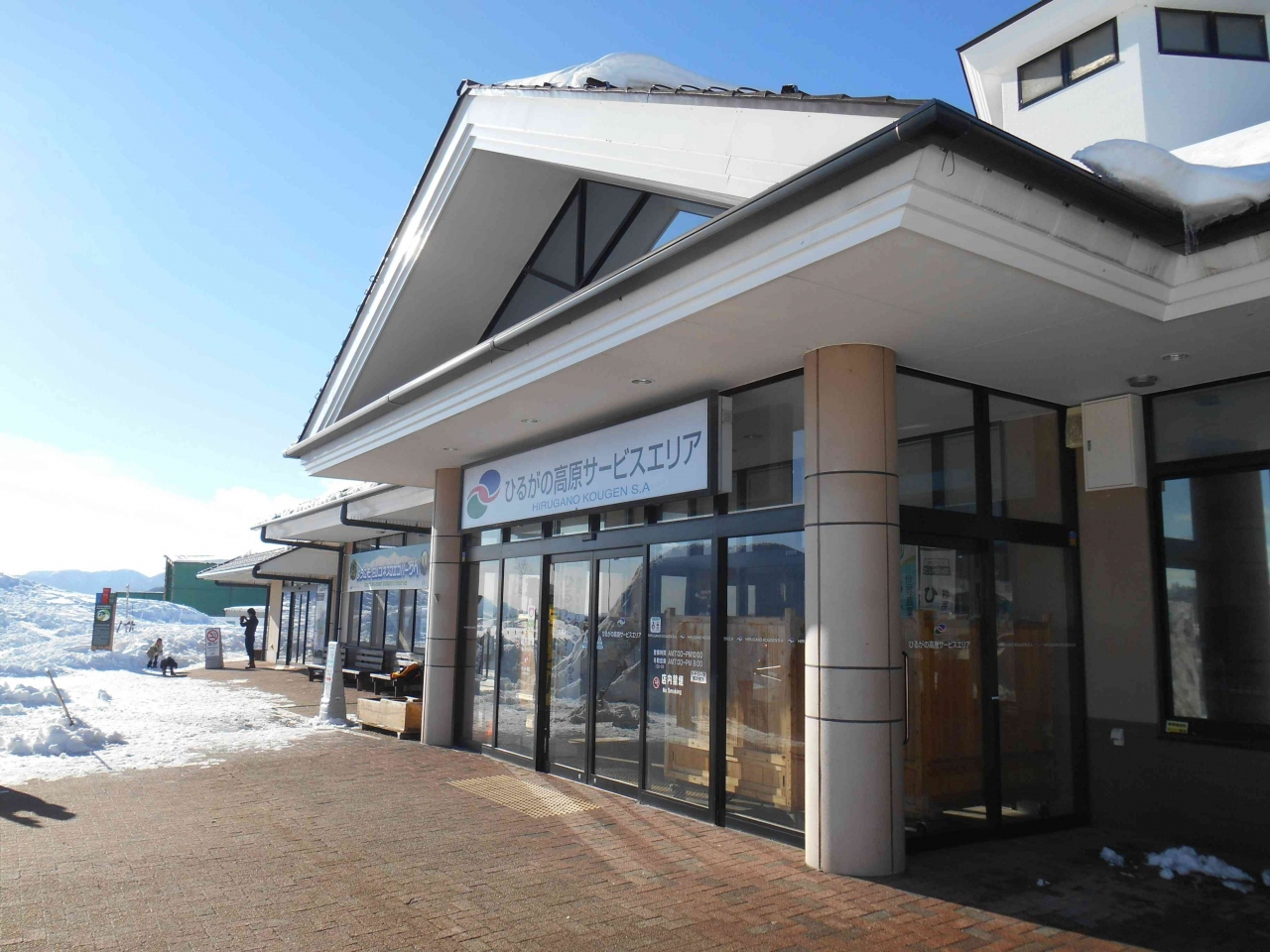 岐阜県郡上市にある、東海北陸自動車道 ひるがの高原サービスエリア下り線(金沢方面)です。こちらは標高が高い場所にあるので、冬が結構な量の雪が積もっています。チェーン規制もあるかと思いますが、スタッドレスタイヤを履いていないといけませんね。周りには、スキー場もたくさんあります。