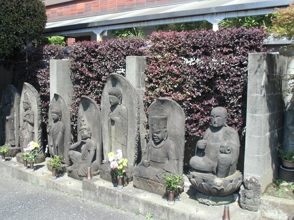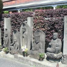 外壁沿いにある子守地蔵と境内右手に並ぶ7体の石仏も目だちます。