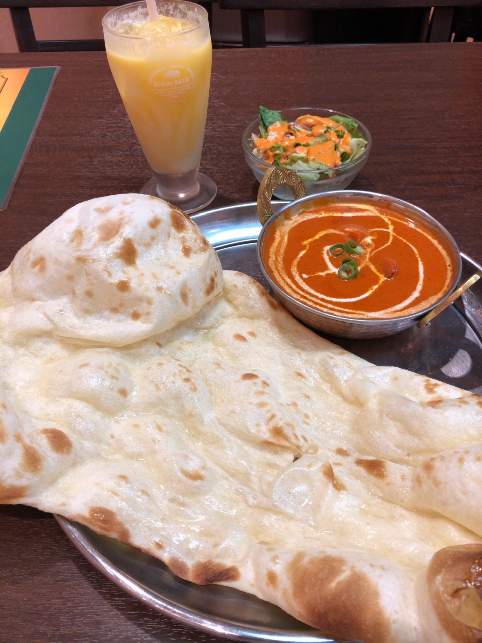 バターチキンとナン、マンゴーラッシーをオーダー。辛さも4段階から選べます。今日は下から2番目普通を選びました。