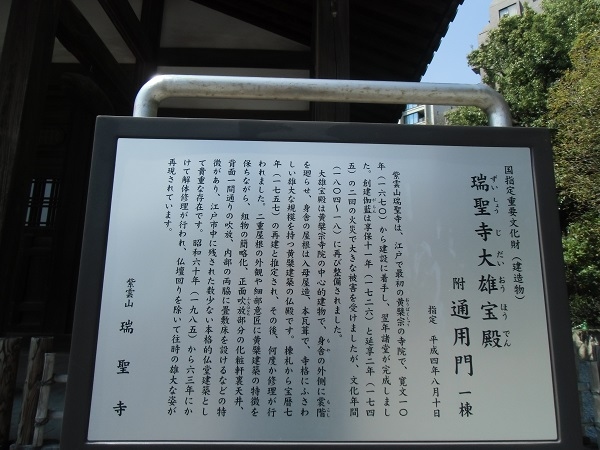 白金台駅2番出口から目黒通りを挟んだ反対側にある瑞聖寺(黄檗宗)の本堂です。