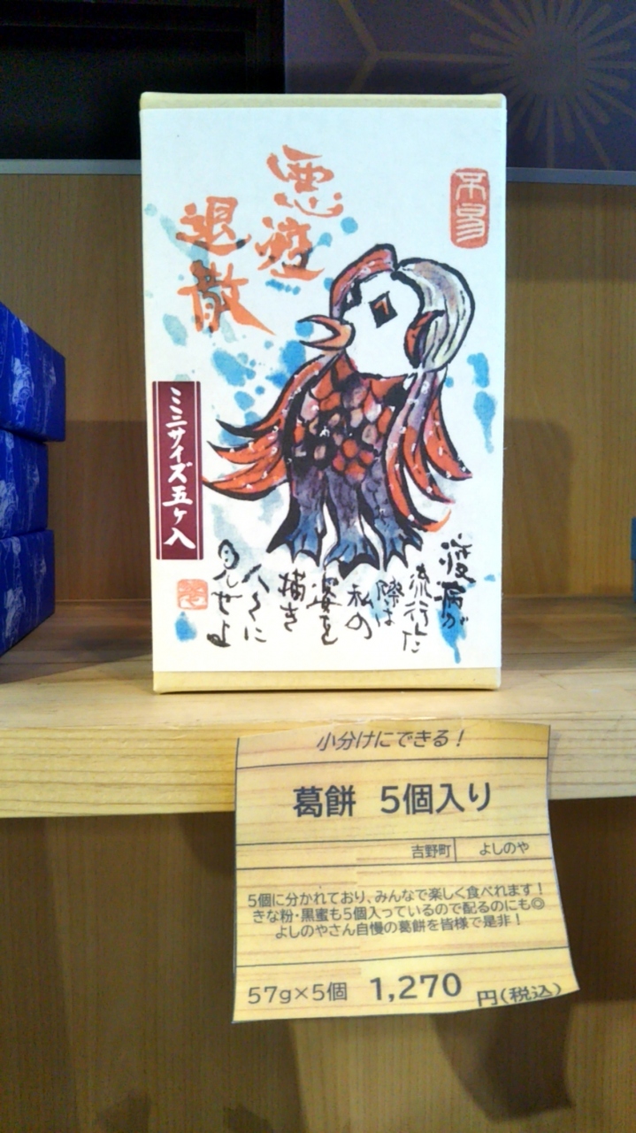 日本橋にある奈良県のアンテナショップ「奈良まほろば館」にて、「葛もち」が販売されていますが、なかでも「最強葛もち」を発見しました!「疫病退散 葛もち」です!疫病流行時に疫病除け「アマビエ」が描かれた葛もちで、名だたる神社や寺院の多い奈良県だけにとても効果がありそうです。