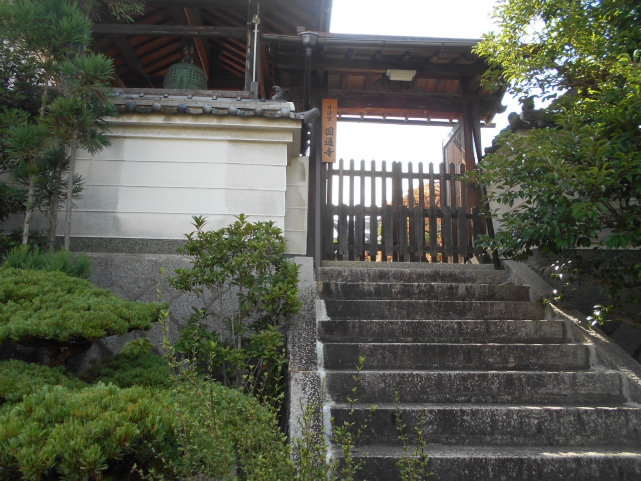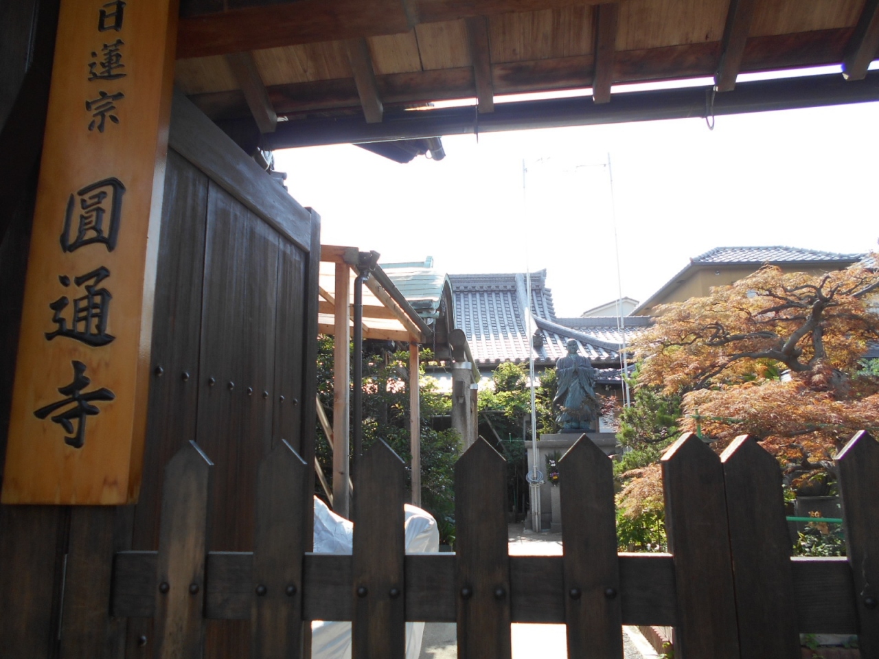 円通寺は、阪急富田駅から南へ約10分ほど歩いたところ、昔ながらの町並み、細い坂道の横にある日蓮宗の寺院です。石段をのぼったところに山門があります。門は開いていて(中には入れませんが)日蓮上人の像が見えました。門前にある円通寺石碑は、かつて唐崎一帯に及ぶほど盛んだった、源氏講という多数の信者が集まり住職の話に耳を傾けた、その風習の跡を記したものだそうです。
