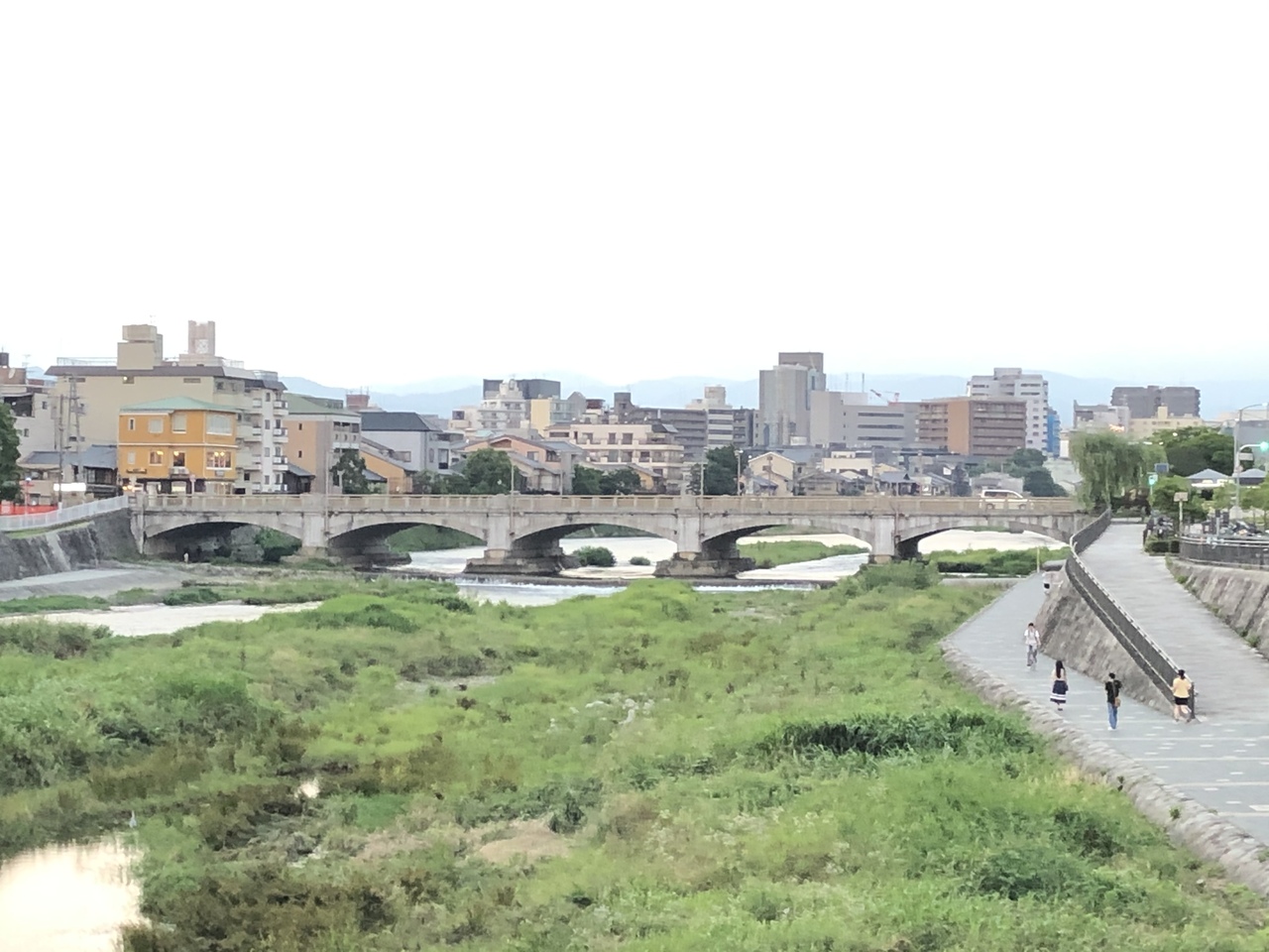 気温の高い時期にも川のあたりはやや涼しい空気が流れています。鴨川沿いには高級ホテルや食事処などが立ち並び、京都でもひときわいいエリアとなっているようですが、さらに下って駅の方になるとちょっと雰囲気が変わって、単なる川という感じでした。開発が進むと、南の方ももう少し高級感でてくるのかもしれませんね。