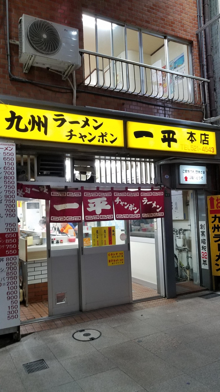 一平本店は、小倉駅南口から銀天街商店街に入ってすぐのところにある豚骨ラーメン店です。黄色の目立つ看板と「ちゃんぽん」に誘われて、飲み会の後の締めで入店。ちゃんぽんは売り切れだったので普通のラーメンを頼みました。チャーシュー、キクラゲ、ネギなどのシンプルな豚骨、コクがあるけど臭みがなく、とても食べやすかったです。