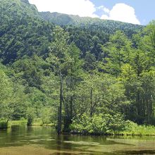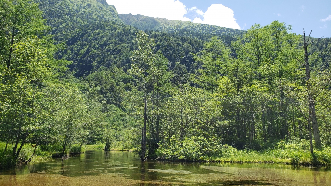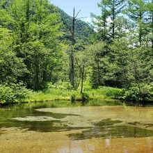 大正池から河童橋のちょうど中間ぐらいにある池。大正池は深いエメラルドグリーンの池だがこちらは水深浅く、透き通った渓流といった感じ。大正池と同じく年々湿地帯に変化しているようだ。上高地の池はそれぞれが独自の個性があって非常に見ごたえがある。