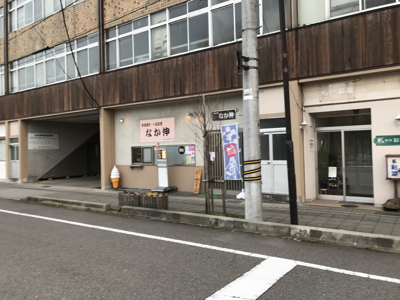片山津温泉総湯の目の前にあるお好み焼き屋。湯上りの後にちょうど良い場所にあるビル1階の道路に面した店頭窓口もある店舗。ポカポカした湯上りの身体を冷ますために、ソフトクリームを頼む。柴山潟湖畔で食べると清々しい気持ちになる。