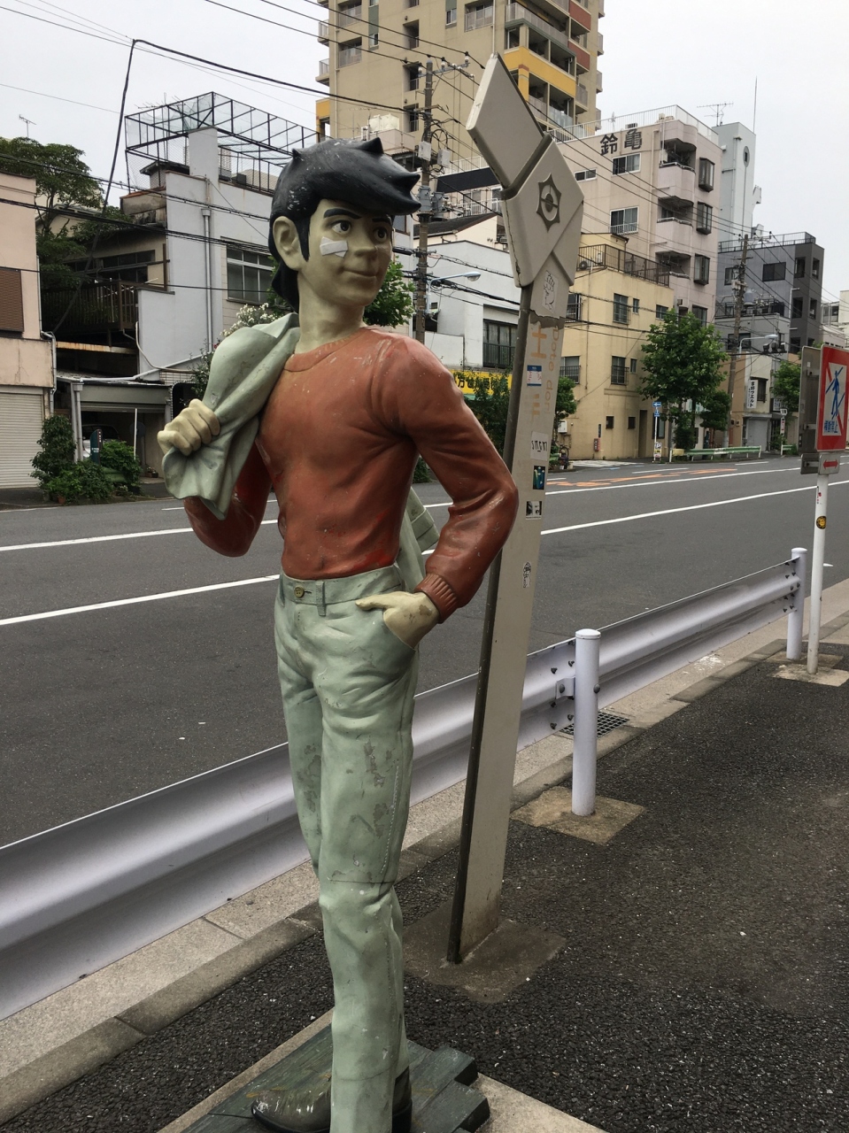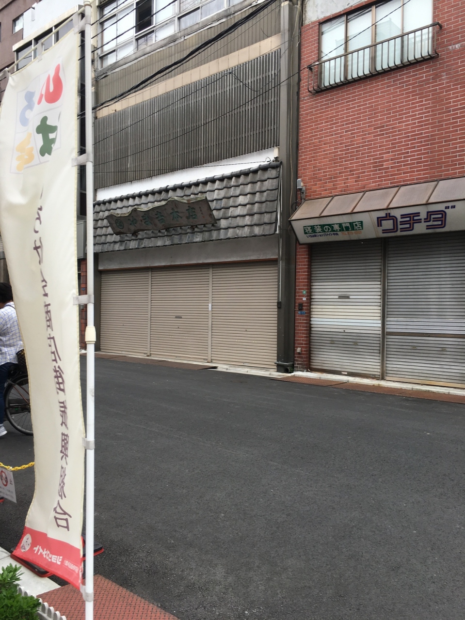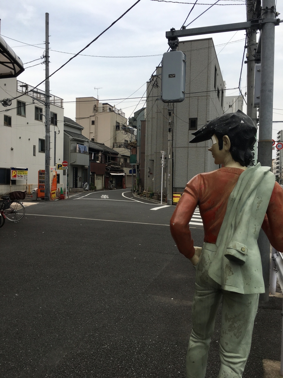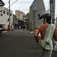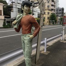 ぼうっと歩いていると幟がいくつかあったので商店街とわかりましたが、店が連なってなく、ぽつんぽつんと離れてありました。人もあまりいなく自動車も通れる商店街です。出入口付近には漫画あしたのジョーの主人公の像がありました。