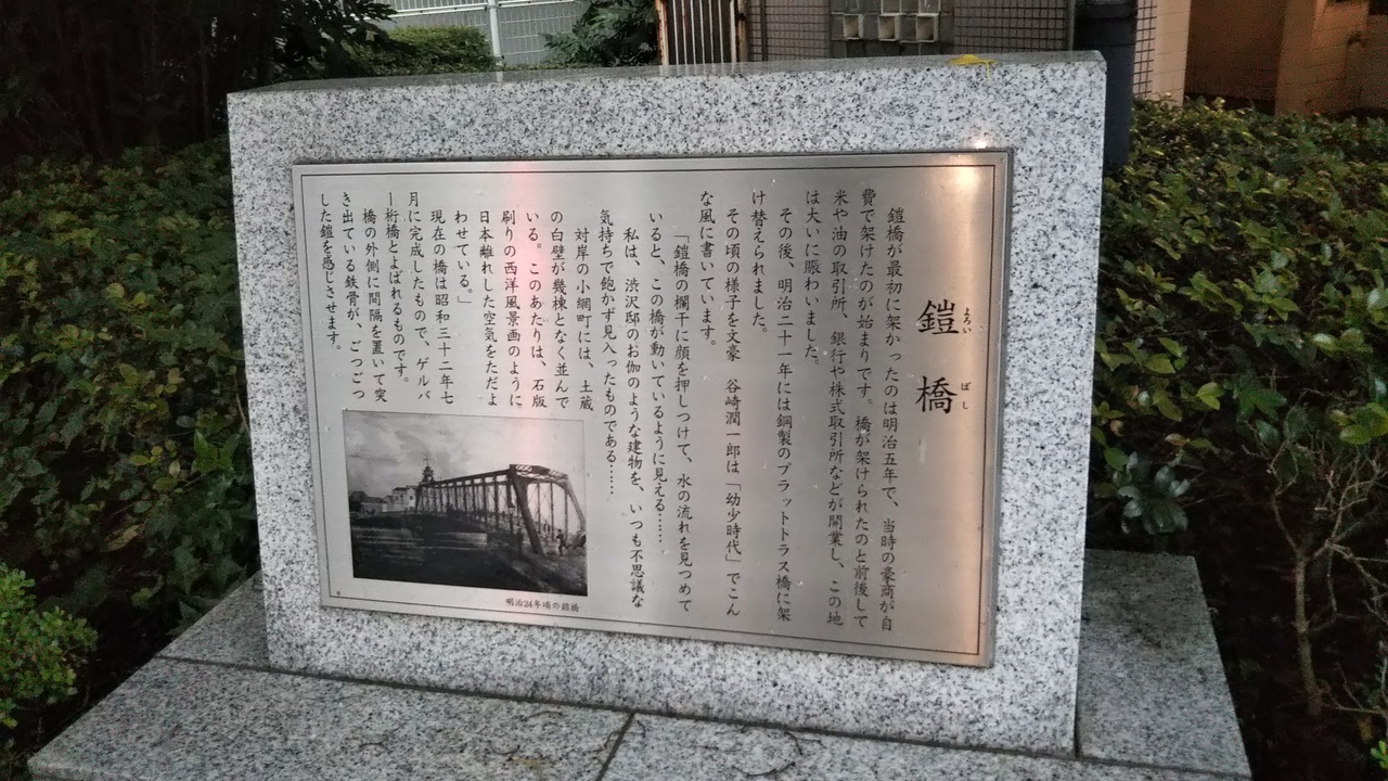 蛎殻町の五差路で左へ向かう新大橋通りから離れ、右の平成通りへと向かうのがこの鎧橋です。上流の日本橋、江戸橋、下流の茅場橋に比べて道幅も狭く、頭上は首都高に覆われているので、昼でも何となく暗い感じがします。。なので決して悪い雰囲気では無いのに、華やかさが有りません。