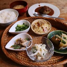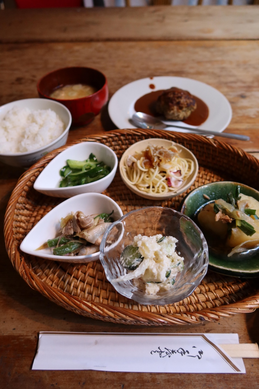 頂いたのはハンバーグの籠盛ランチ。籠に5つの小皿に小料理、それとサラダ、味噌汁、ハンバーグ、ライス、珈琲がついて1500円、値段は少し高いですが、家庭的な料理と美味しい珈琲、そして気さくな女将との会話が楽しめるお店でした。