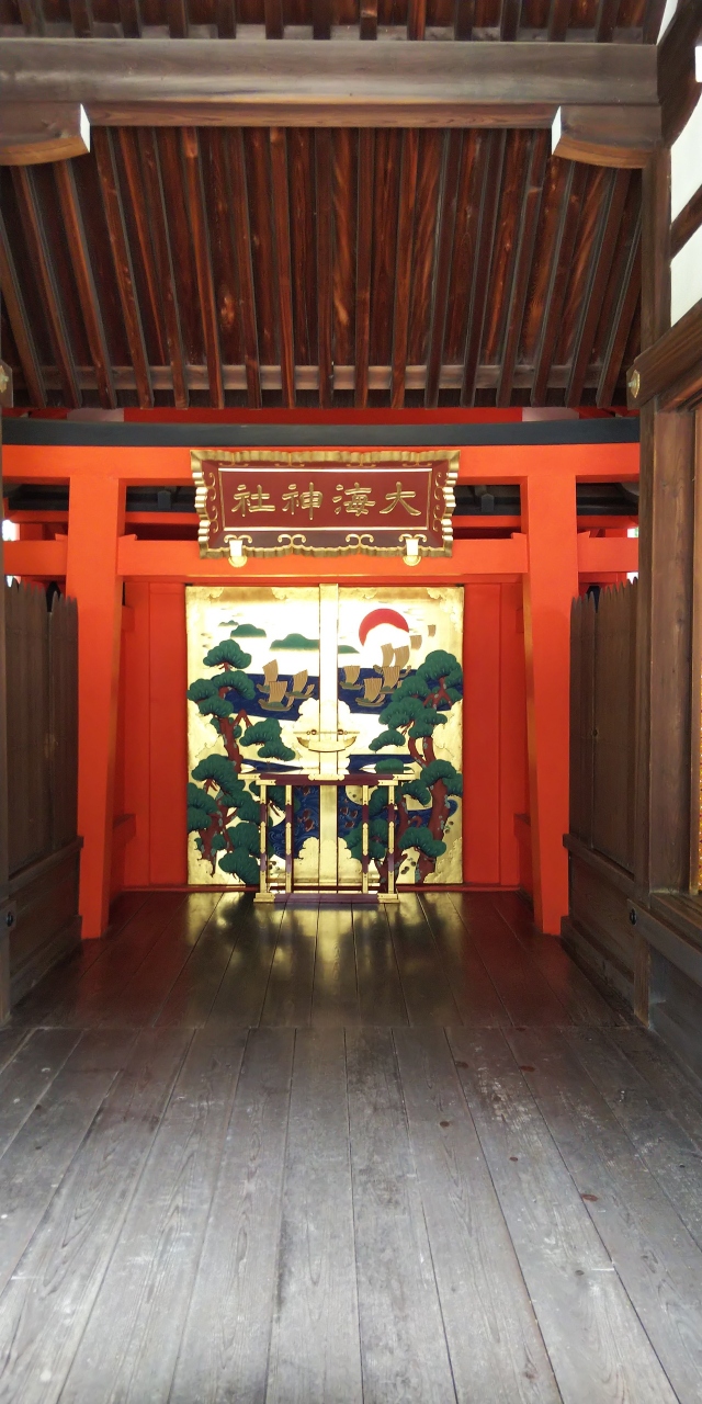 大海神社は住吉大社の摂社のひとつで、住吉大社の境内の北側にあります。御祭神は豊玉彦命と豊玉姫命がまつられています。本殿の建物内にも朱塗りの鳥居があり、その奥には金箔を使用したと思われる美しい扉がありました。