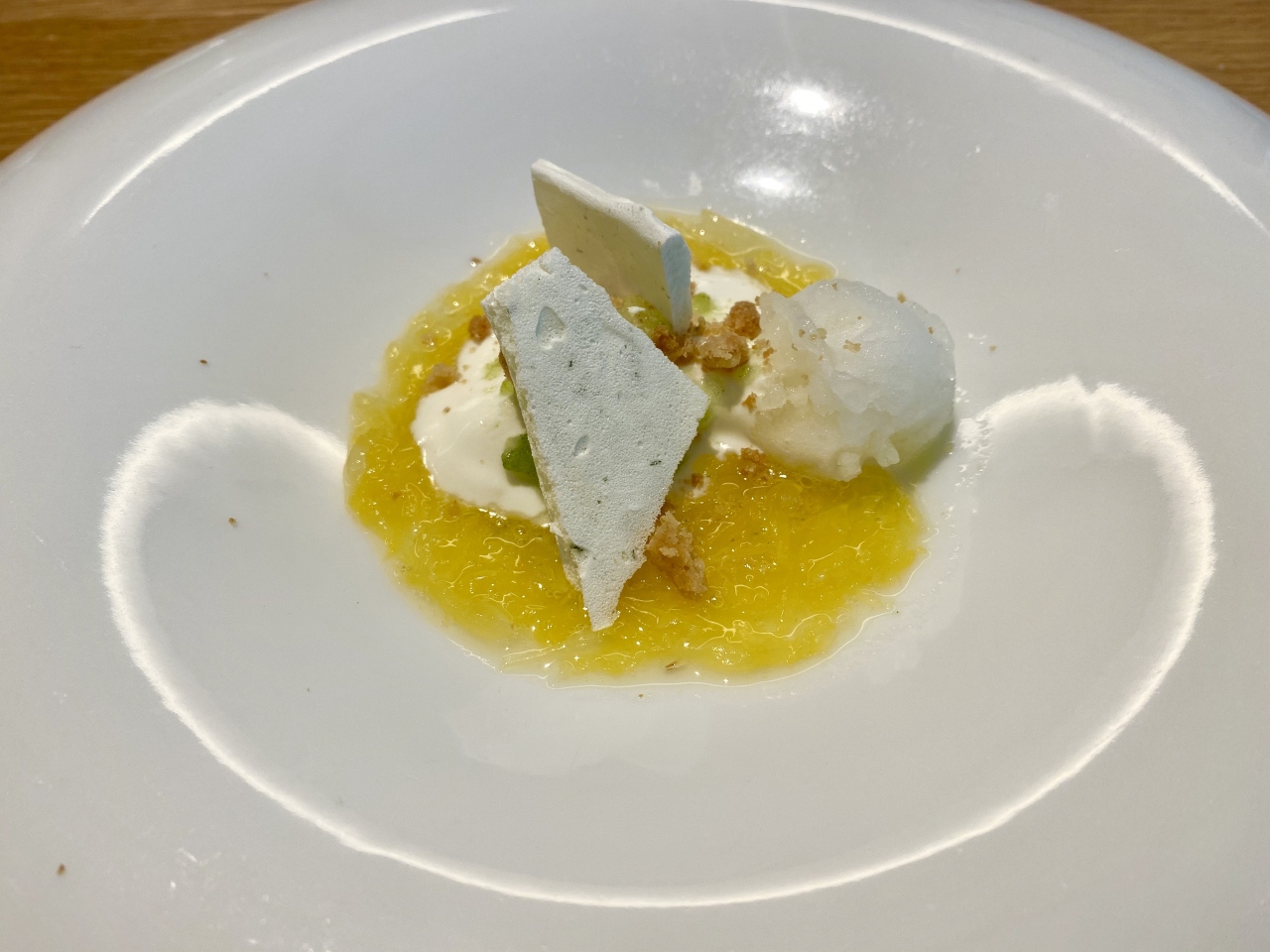デザートはレモンシャーベットの酸味とメレンゲの甘みに夏みかんソースが複雑なうまみ