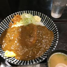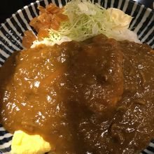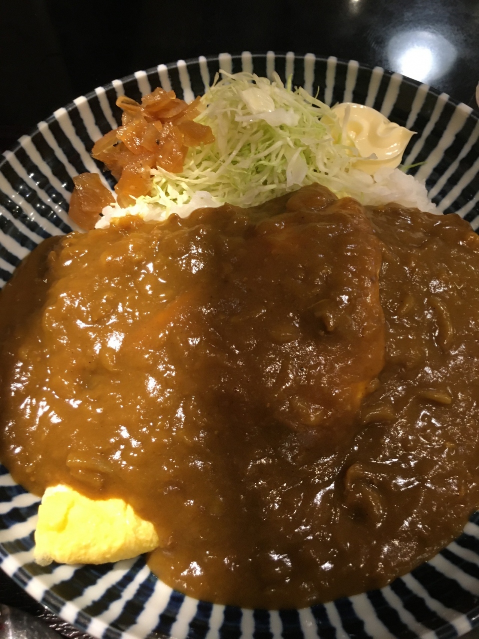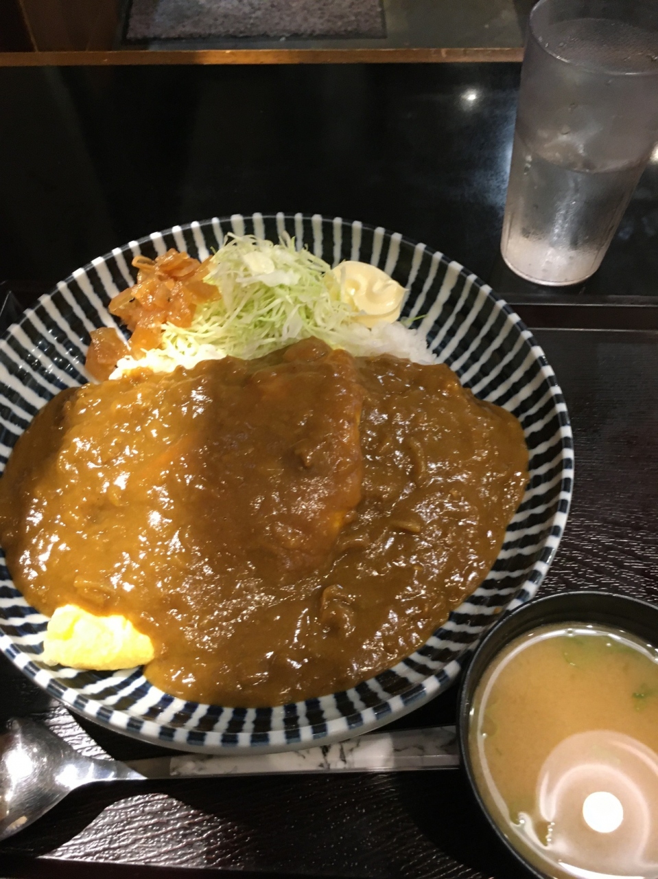 ランチメニューにはカレーが3種あったのでオムカレーを注文。名前のとおり店内は居酒屋の雰囲気でした。ふわっとしたオムレツがのり、ルーは市販のカレーの味がし、味噌汁が付いていましたが少し煮込みすぎの味噌汁でした。