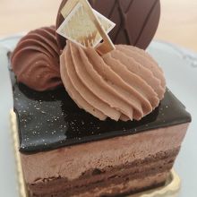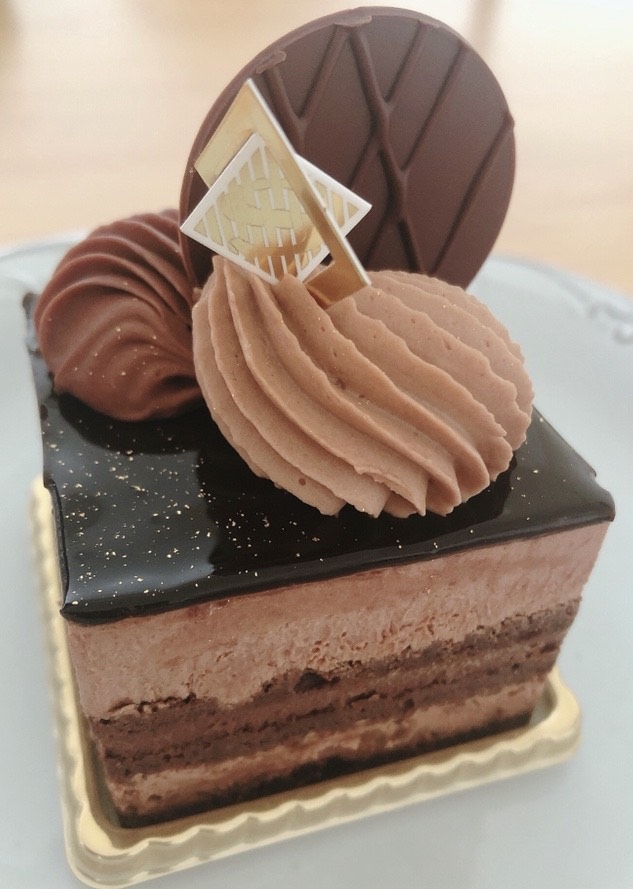 ビスキュイショコラの土台に濃厚なムースショコラ、トップに2種のチョコクリームと薄いチョコというチョコレート尽くしのケーキ。かなり甘いですが、後味にふわっと紅茶?なのかフローラル系の香りが鼻に抜けて上品な後味です。ビスキュイにクラッシュしたチョコが混ざっており、何処を食べても濃いのが凄い。