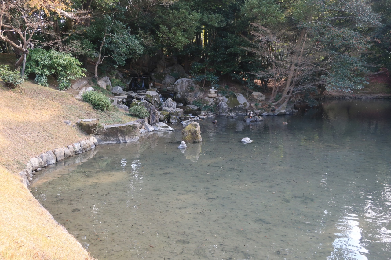 正門から能舞台の方角に回りこんだところに広がる池だ。花と葉という池名が示す通り、夏季にはハスの花が水面を覆い尽くす。が、足を運んだのが梅花の時季だったので、穏やかな水面が広がっているだけだった。奥には滝があり、石組みを施して流れを導いている。一度、ハスの時季に見てみたい池だ。