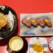 メニューは「黄金のウニが輝く☆あしたか牛炙り寿司と金目鯛の煮付け&桜海老のかき揚げ蕎麦付」でした。牛炙り寿司は、目の前で炙ってくれます。ウニもあしたか牛も、美味でございました♪美味しかったけど、切り身が小さかくて3口で無くなっちゃったのが金目の煮付け。桜えびの揚げ蕎麦は、食べる直前に温かい蕎麦つゆをかける仕様。サクサクのかき揚げが香ばしい♪(?´?`?)見た瞬間は、少ないかな?と思ったけど、意外とお腹いっぱいになりました。