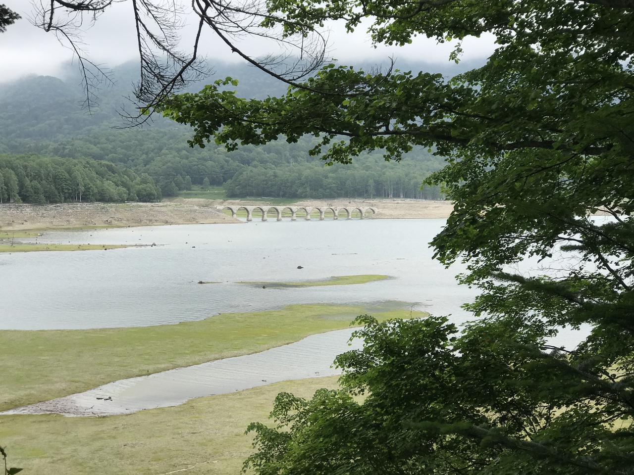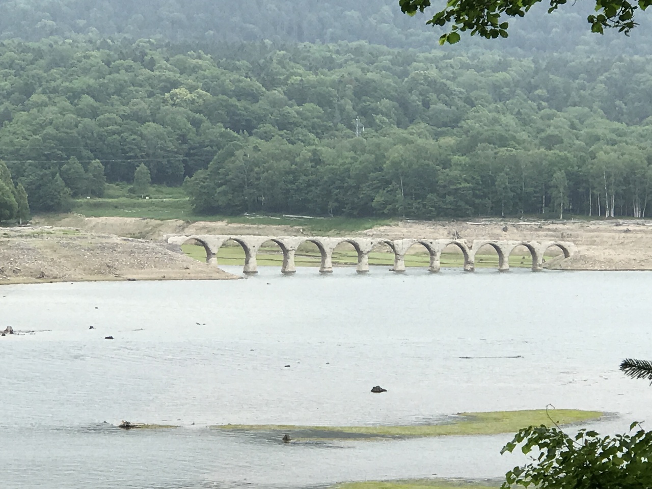 いつ崩落してもおかしくないと聞き、帯広に行ったついでに立ち寄りました。6月ごろから湖に沈み始めると聞いたのでどうかと思いましたが、完全な姿を見ることができました。駐車スペースからも180mなので、それほど歩くことなく見られました。糠平湖の対岸から見ると聞いていたので、米粒みたいにしか見えないのかと思いましたが、意外にもしっかり見られました。湖に沈みゆく橋梁も見てみたいと思いました。国道沿いに幾つかの橋梁跡を見ることができるので、廃線好きな人には楽しめるエリアだと思います。
