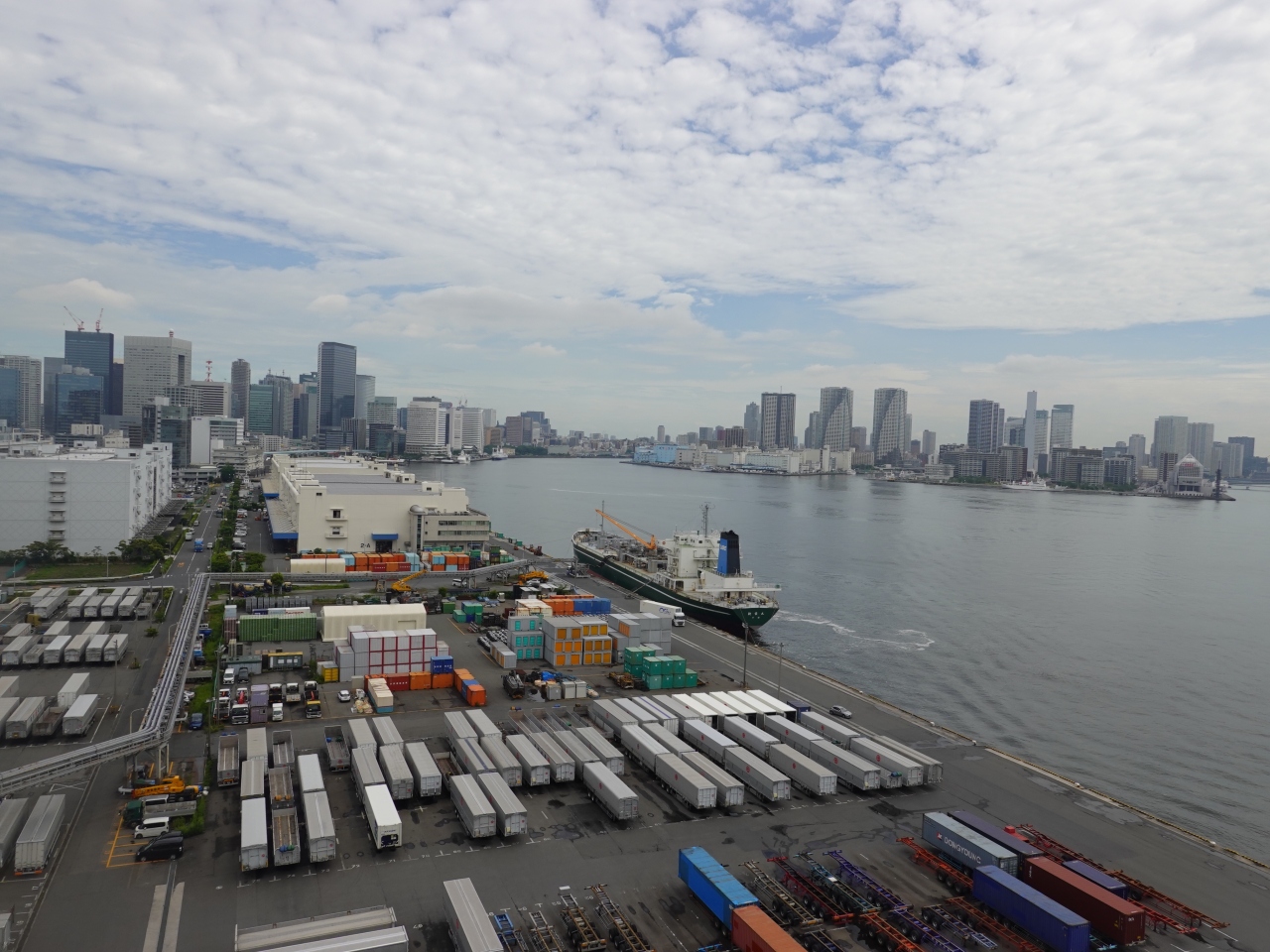 レインボーブリッジの遊歩道の芝浦側の入口「芝浦アンカレイジ」からは眼下に東京湾の姿を眺めることが出来ます。高層ビルが林立し、コンテナの姿も数多く、大都会ならではの光景です。残念なのは超大型客船の姿が無いことです。構造上、入港出来る船の大きさに制限があるためだと思われます。