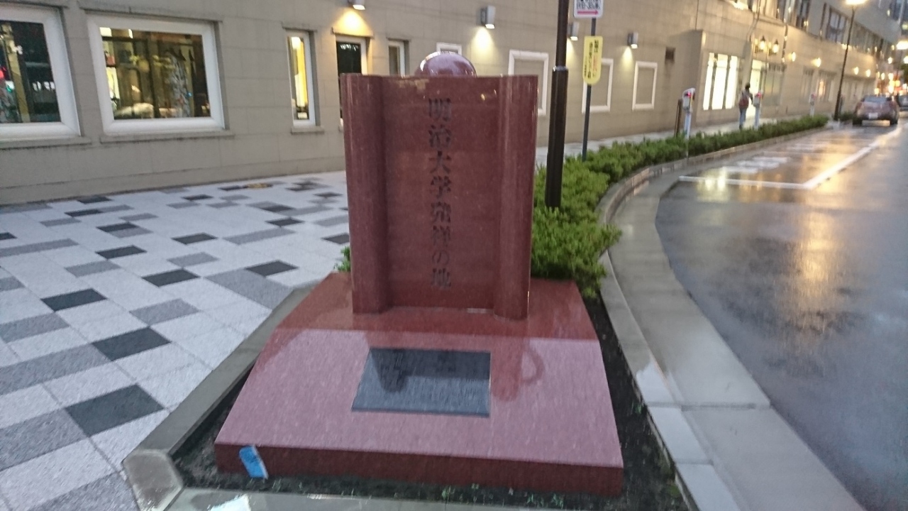 JP有楽町駅からすぐ、銀座ファイブのすぐ脇の歩道に明治大学発祥の地碑があります。江戸時代には島原藩主松平氏の上屋敷が有った場所で、明治14年に明治大学の前身である明治法律学校が開校しました。近くを通る際には碑文を読んでみるのが良いと思います。