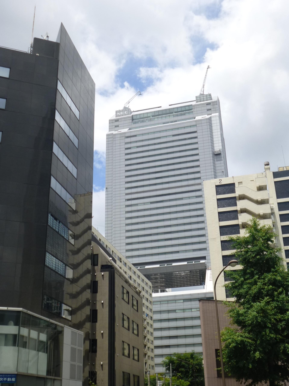 超高層ビルの少ない見たエリアにおいては、地下4階、地上43階建ての「NECスーパータワー」は、遠くからもひときわ目立ちます。竣工から20年以上が経つ現在でも存在感は抜群です。今回見たところ、屋上にクレーンの姿がありました。何らかの工事が行われているのかも知れません。