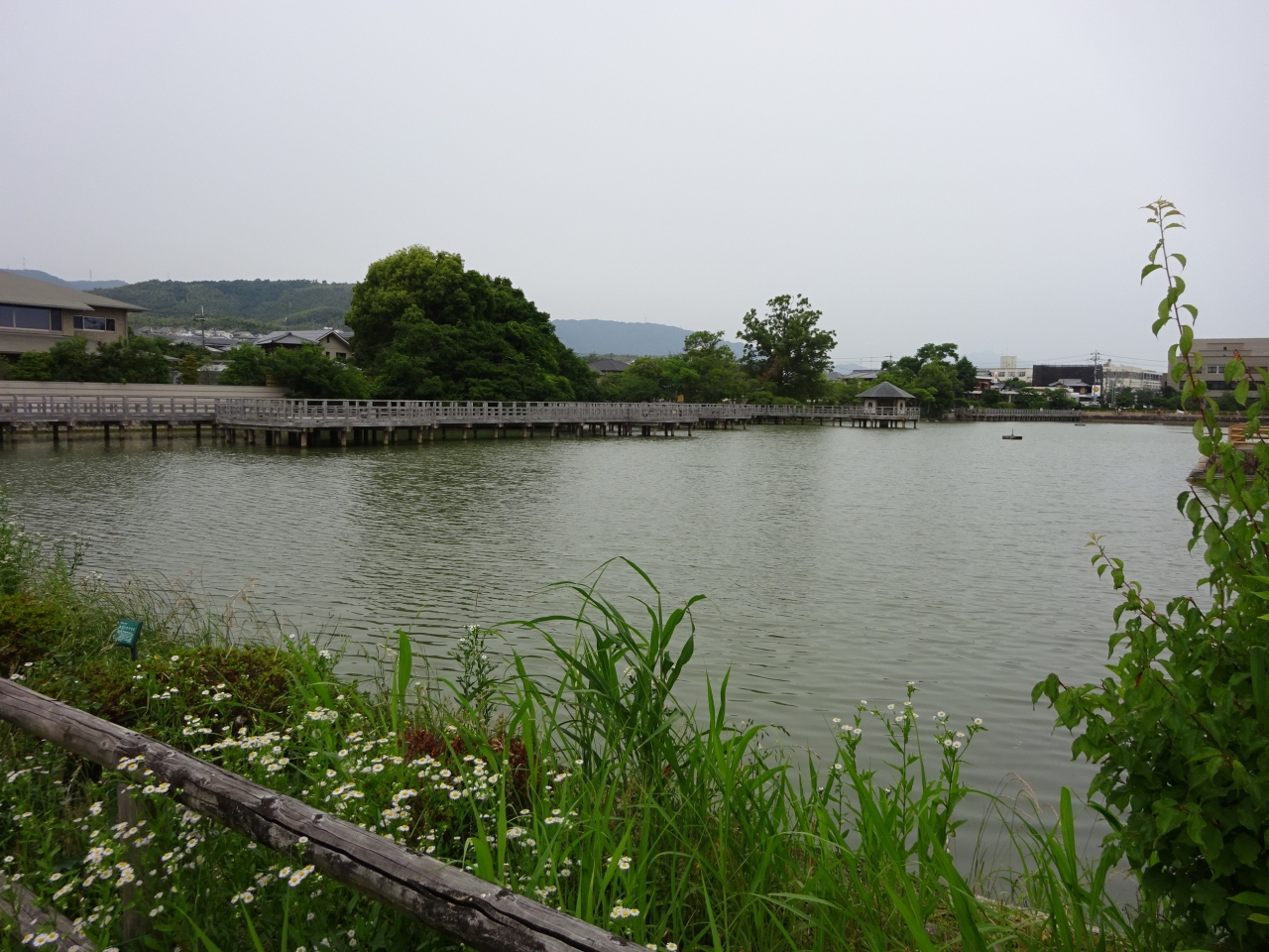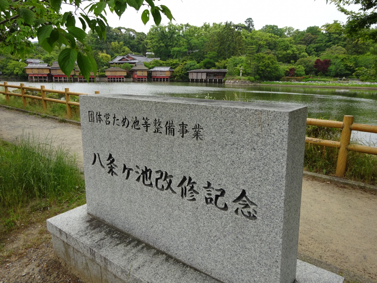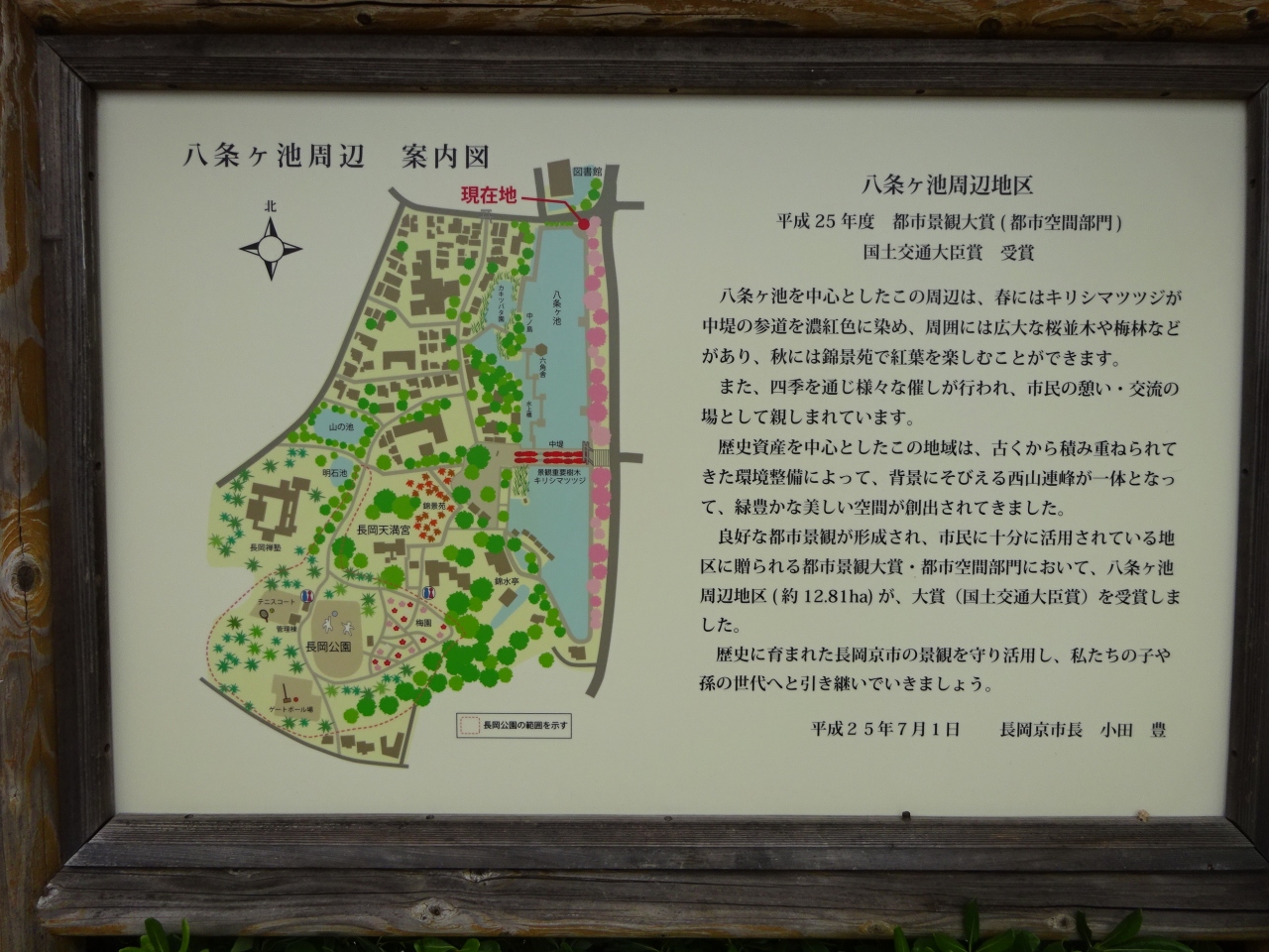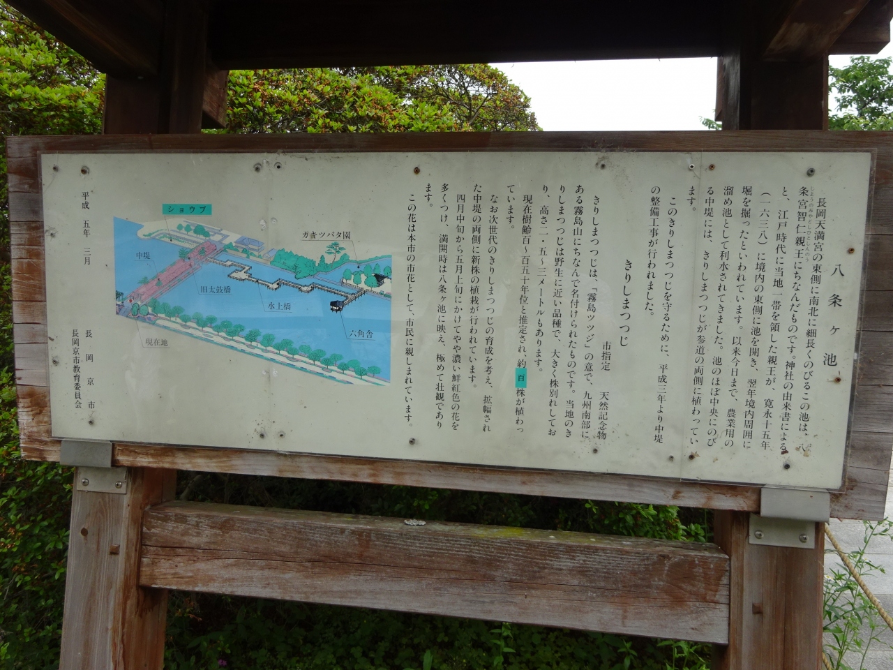 長岡天神の駅から長岡天満宮を目指して歩いて、階段を上って鳥居をくぐると目の前が八条ヶ池でした。天満宮の参道が池を両断していて左側の池には料亭の錦水亭の個室が池にはりだしています。右側の池には水上橋があり、左側よりも広いです。